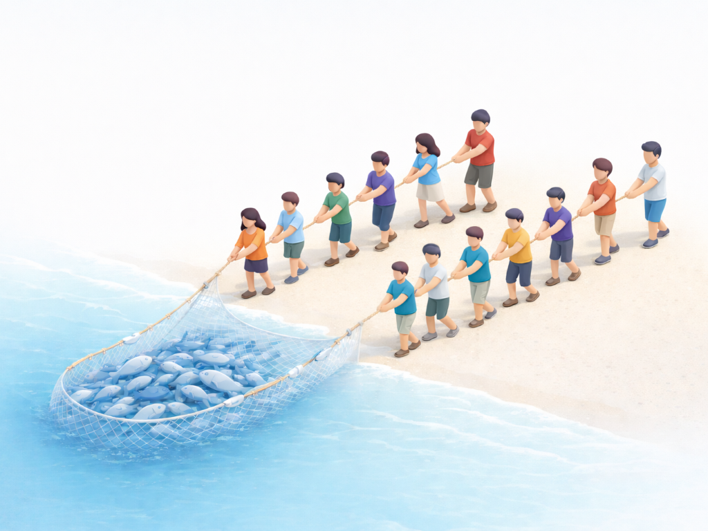 海岸から大きな網をみんなで力を合わせて曳いて魚を獲る、伝統的な体験を楽しめます。